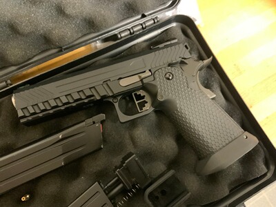 Zum Verkauf steht die GBB Pistole HX2003 Hi-Capa 5.1 von AW Custom. Diese Pistole ist in einem Set mit umfangreichem Zubehör erhältlich.
