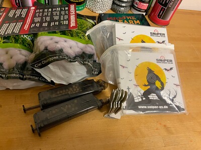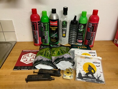 - Drei volle und zwei halbvolle Flaschen Softair Gas