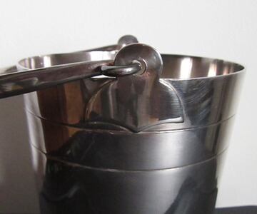 Ein luxuriöses Accessoire für alle die eine moderne und elegante Tischkultur pflegen. Versilberter Eiswürfelbehälter der Silberschmiede Christofle, Modell Biaritz um 1940. Eiseimer/ Flaschenkühler im Stil des Art Déco, runder gerader Stand, die sich konisch erweiternde Wandung mit umlaufendem dezenten Rillendekor. Der Eiseimer verfügt über eine klappbare übergreifende Handhabe. Dieses einzigartige Vintage-Objekt kann man als Eiseimer, Eiswürfelbehälter oder als Kühler für kleine Piccoloflaschen einsetzen. Der Eimer weist im Innenbereich dem Alter entsprechende Gebrauchsspuren auf. Gepunzt ist das schöne Stück auf der Bodenseite mit Christofle. Der Eimer muss ggf. aufpoliert werden.