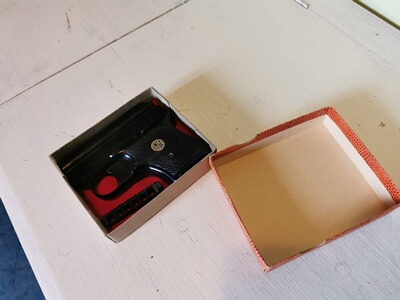 Hier gibt es eine sehr gute EM-GE modell 63 in 6mm platz in der Originalschachtel, komplett mit Magazin.