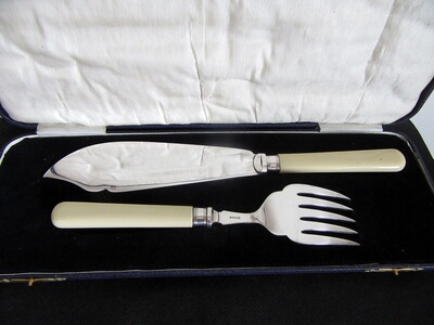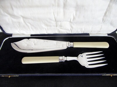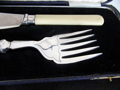 Charmantes versilbertes Vorlegebesteck der englischen Silberschmiede James Dixon aus Sheffield. Die Punze verweist auf die Herstellungsjahre 1890 bis 1893. Dieses einzigartige Besteck befindet sich in einem unbenutzten Zustand und weist nur eine dem Alter entsprechende Patina auf. Die eine Seite der Klinge weist am oberen Rand eine feine Ziselierung in Form eines Mäanderbandes, welches durch zwei Jugendstil-Ornamente unterbrochen ist, auf. Der Zinken weist auf der Oberseite die das gleiche Mäanderband auf. Beide Teile weisen die Herstellerpunzierung auf. Zugehörig ist die original Box,die leichte Beschädigungen der Ober- und Standfläche aufweist.