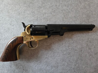 Verkaufe hier wegen Verkleinerung meiner Sammlung einen schönen Perkussionsrevolver Colt Navy 1851 in schwarz/messing mit Holzoptikgriffschalen.
