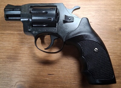 Der Revolver hat Einbrennungsspuren an der Trommel, er wurde gebraucht. Heutzutage dürfen Schreckschussrevolver in dieser Art und Weiße nicht mehr produziert, aber noch verkauft werden.