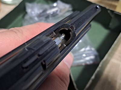 Die Waffe eignet sich evtl. auch zur SV. Die Laufsperre liegt weit hinten und ist ohne Licht kaum zu sehen. Sie ist im alten PTB 387, das Jahr ist wohl 1991 (Beschuss KB).