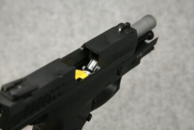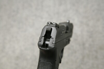 Kaliber 9 mm Luger. Lauflänge 90 mm, Novak 3-Dot Visierung. Stahl-Verschluss mit Rost resistenter Beschichtung, Polymer-Griffstück, Picatinny-Schiene, beidseitiger Magazinhalter, aussenliegender Hahn, Entspannsicherung, DA-/SA-Abzug. Magazine mit Griffadapter und Fingerauflage, Magazinkapazität 17 Patronen. Gesamtlänge 174 mm, Gewicht ca. 710 g.