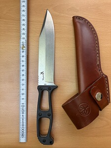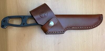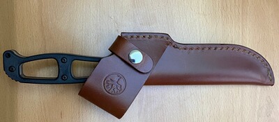 Das Schlagstück im Griffende erweitert das Einsatzspektrum. Die hochwertige Lederscheide, sowohl links wie rechts tragbar, ist fu?r Lennartz´ favorisierte Trageweise „Cross Draw“ ausgelegt, d.h. das Messer sitzt diagonal am Gürtel und kann leicht gezogen oder weggesteckt werden. Die Sicherung erfolgt per zweiseitig bedienbarem Druckknopfriegel.