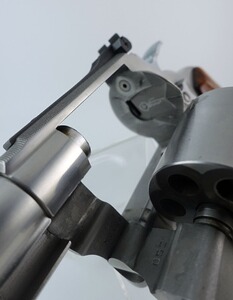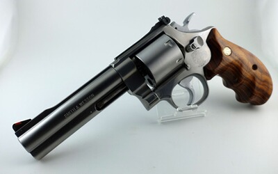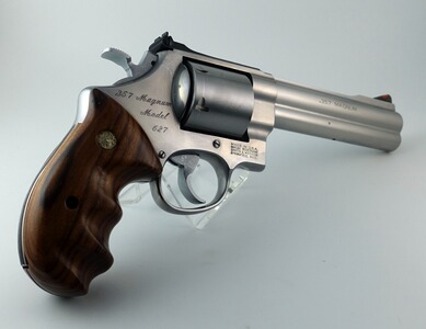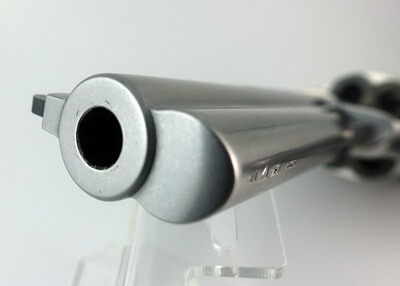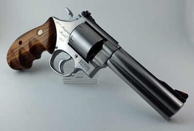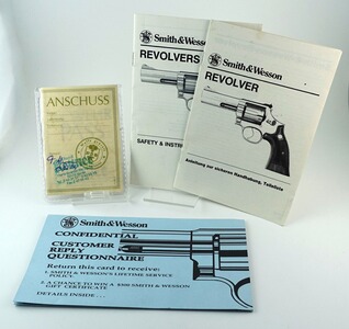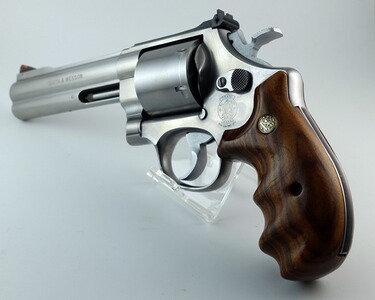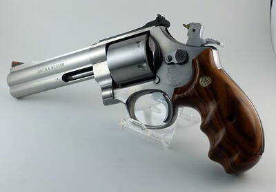 Produktbeschreibung: Wuchtiger .357 Magnum Smith & Wesson Edelstahl Revolver auf Basis des eigentlich für .44 Magnum eingesetzten N-Rahmens. "Ungeflutete" Trommel. Finish im Grunde neuwertig, Lauf blank. Schöne Goncalo Alves Holzgriffschalen mit S&W Medallion. Aus der Serie 627-0.