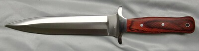 Massives und optisch ansprechendes Jagdmesser. Die 4 mm starke, beidseitig geschliffene Klinge aus rostfreiem 440-Stahl mit Schweißrinne eignet sich sowohl zum Abfangen von starkem Wild als auch für härteste Einsätze im Outdoorbereich. Ausladendes Parierelement erlaubt sicheres Arbeiten. Griffschalen aus attraktivem Pakkaholz.