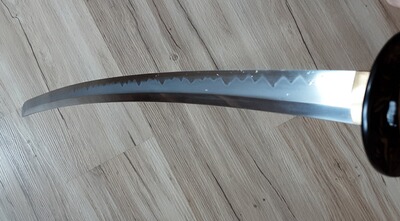 Laut Hersteller ist die Klinge aus T10 Stahl. Weiterhin hat die Klinge eine spezielle Politur und eine seltenere Shobu Zukuri Klingenform. Sie ist ca. 71 cm lang, 3,2 cm breit am Griff, 2,4 cm breit an der Spitze, 7 mm stark am Griff und 5 mm an der Spitze. Die Klinge ist ordentlich scharf.