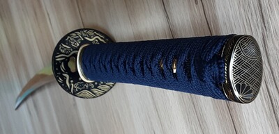 Der Griff ist mit dunkelblauem Band gewickelt und schwarzer Rochenhaut unterlegt. Die Wicklung ist meiner Ansicht nach ordnetlich gemacht und auch fest. Der Griff ist ca. 26,5 cm lang.