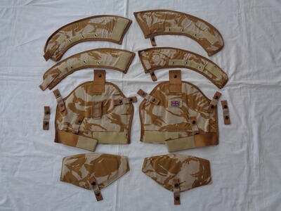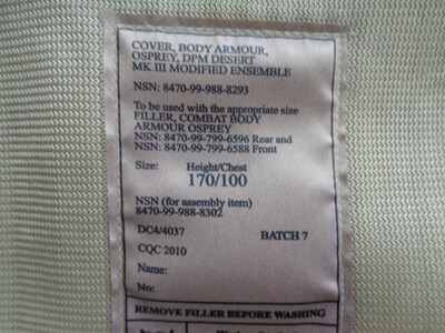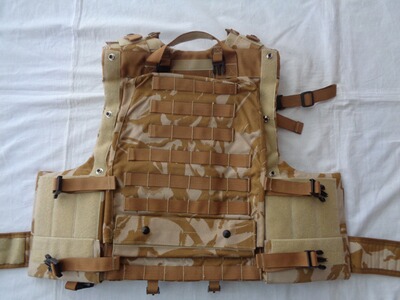 - Plattenträger/Weste „ Cover, Body Armor, Osprey, DPM Desert, MKIII Modified Ensemble“ zur Aufnahme der NATO-Standard Kevlareinlagen, vorne und hinten extra Fach für Traumaplatten auf Herzhöhe, seitliche Aufnahmen für Kevlarplatten, seitlich und an den Schultern durch Klett verstellbar, MOLLE-Bebänderung an allen Seiten, Riemenbefestigung für SA80 Sturmgewehr (rechts), Schlaufe für Rangabzeichen, Bergegriff auf der Rückseite, Innenfutter aus MESH-Gewebe, etc.