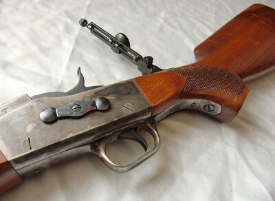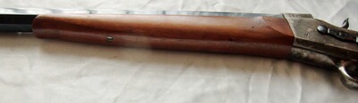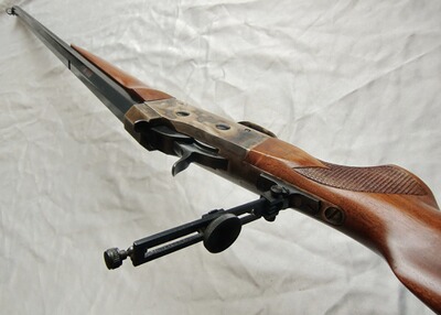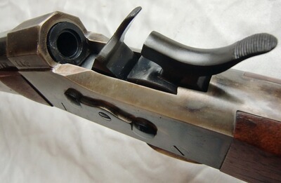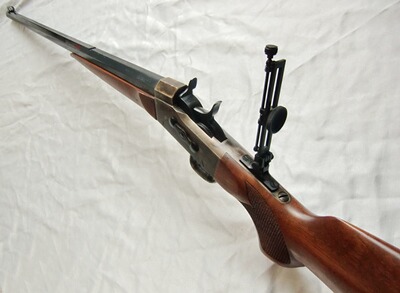 Besonders eindrucksvoller Pedersoli-Nachbau des historischen Modells von 1874. Als Scheibenwaffe anlässlich des legendären Creedmoor-Schießens" von englischen und amerikanischen Teams erfolgreich eingesetzt. Das Rolling-Block-System galt damals schon als besonders zuverlässig und hat diese Waffe berühmt gemacht.