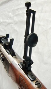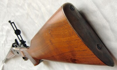 Auf dem Kolbenhals wurde ein verstellbarer Spindeldiopter montiert. Die orig, Kimme wurde dazu entfernt, ist jedoch noch vorhanden und liegt lose bei.