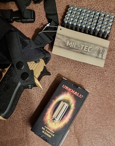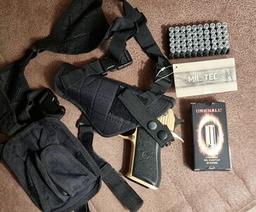 Bei Sofort-Kauf gibt es noch 50 Schuss extra laute 9mm Munition (Urknall) und ein neues Schulterholster von Mil-Tec dazu (siehe Fotos).