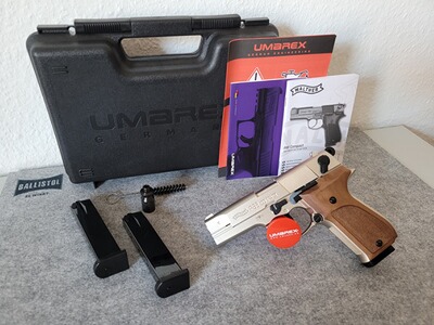 Ausführung: Vernickelt mit Holzgriffschalen. Mit Prägung „Carl Walther“ auf dem Verschluss!