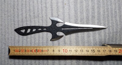 Versteigert wird ein besonders ausgefallenes Set aus drei Wurfmessern mit auffälligem Fantasy-Look. Die Messer sind aus Ganzstahl gefertigt, schwarz-silbern beschichtet und verfügen über spezielle Aussparungen im Griff sowie auffällige Klingenformen – ideal für Sammler, Einsteiger und Hobby-Werfer!