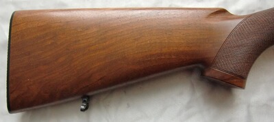 Gerade Holzschäftung mit schöner Maserung, ohne Backe, mit Pistolengriff, ganz leichte Schränkung für Re.-Schützen, dünne Kunststoffschaftkappe, Sicherungsschieber auf dem Kolbenhals. Vorderschaft und Pistolengriff mit scharf geschnittener, deutscher Fischhaut.