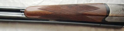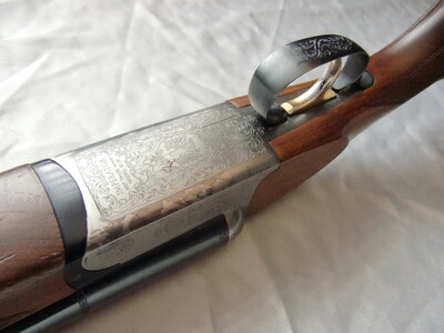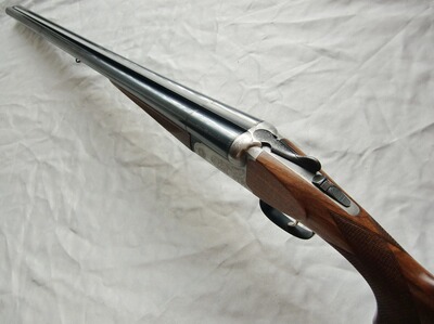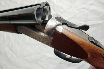 Eine schmucke und gut verarbeitete Doppelflinte mit gravierter Stahlbasküle, doppelter Laufhakenverriegelung und Einabzug mit autom. Umschaltung. Die Läufe können von der Schussfolge her individuell ausgewählt werden mittels Umschalthebel auf dem Sicherungsschieber. Hier ist auch kein, beim nachladen störender, Greenerriegel im Weg. Mit Ejektoren, Perlkorn, incl. Riemenbügeln. Schmucke, handgestochene Arabeskengravur auf der Basküle, Finish: hochglanzbrüniert mit silberner Basküle.