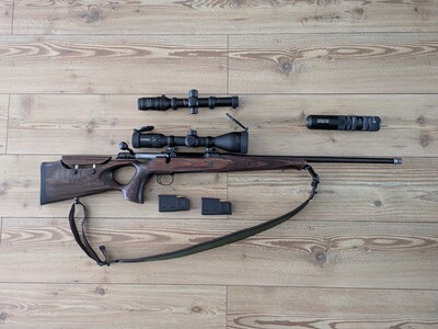 Die Waffe hat < 500 Schuss hinter sich, befindet sich in einen gebrauchten, aber gepflegten Zustand, hinzuweisen ist hier auf die Klebereste an den ZF, und Leiche Abnutzen an der Brünierung des Lauf durch die SD-Nutzung. Bei den weißen Schlieren am SD handelt es sich um Keramikpaste, damit die einzelnen Elemente sich nicht "festbacken" und sich leichter lösen lassen.