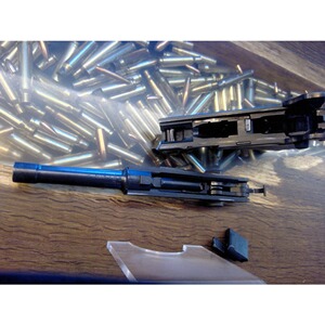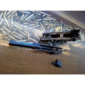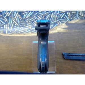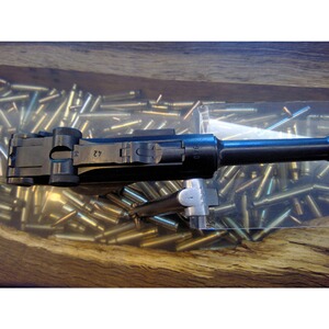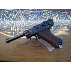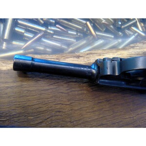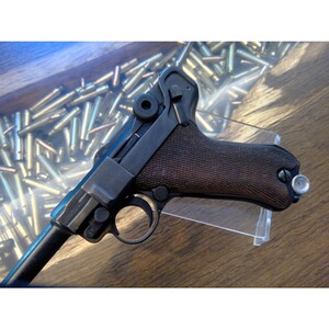 Halbautomatische Pistole Mauser P08 Luger im Kaliber 9mm Luger. Herstellungsjahr 1940. Herstellercode 42 = Mauser Fertigung. Neubeschuss dezent an Laufunterseite vorhanden. Weitestgehende Nummerngleich incl. nummerngleichem Magazin in sehr gutem Zustand. Nicht nummerngleich sind Schlagbolzen und Verschlussfang (überstempelt). Nachbrüniert. Lauf in sehr gutem Zustand. Sichtbare Spuren von der Nutzung ( siehe Bilder)