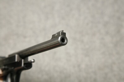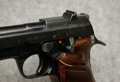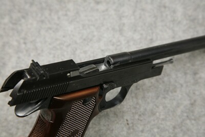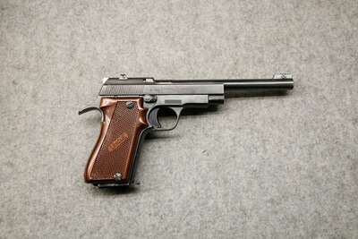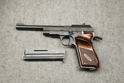 Kaliber .22 lfB (.22 lr). Lauflänge 153 mm, präzisionsfördernder feststehender Lauf, seitenverstellbares Visier. Stabiler, vorne geschlossener Verschluß, aussenliegender Hahn, Single-Action-Abzug, Drehhebelsicherung links, Zerlegehebel rechts. Griffschalen mit Daumenauflage links. Auf der linken Seite ist an der Kunststoff-Griffschale oben links ein Stück abgebrochen. Magazin für 10 Patronen, untenliegender Magazinhalter. Stahlteile brüniert.