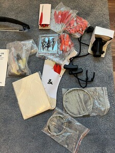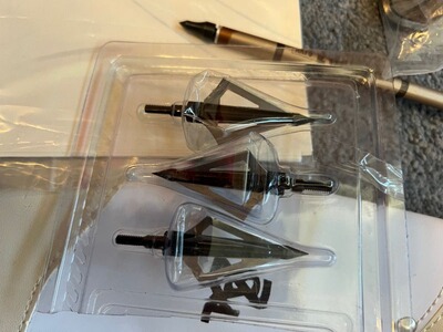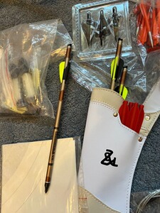 Es ist einiges an Zubehör dabei, siehe Fotos. Viele Bolzen, 3 mit Schraubgewinde um die 3 Jagdspitzen aufzuschrauben, kleine, mittlere sowie große Bolzen.