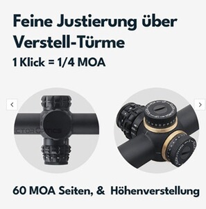 - Verstellung: 1/4MOA (100 Klicks = 25MOA pro Umdrehung)