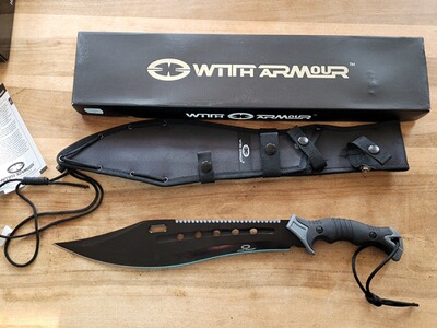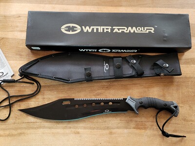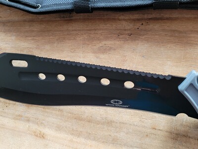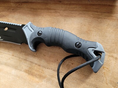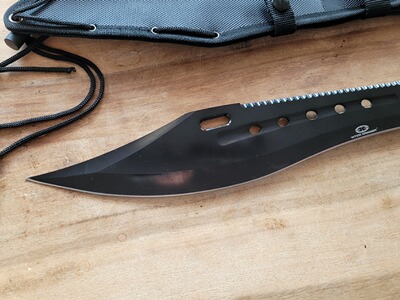 Eine kräftige Tactical-Machete mit schwarz beschichteter, vorderlastiger Klinge. Der Griff aus gummiertem Kunststoff liegt aufgrund der kräftigen Fingerrille und Daumenauflage sicher in der Hand.