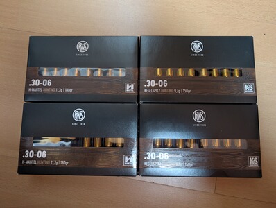 Mit verkauft wird noch RWS Munition. 25 Schuss H-Mantel 10,7 Gramm und 40 Schuss Kegelspitz 9,7 Gramm für zusammen 195,- €. Beide Laborierungen jeweils eine Losnummer.