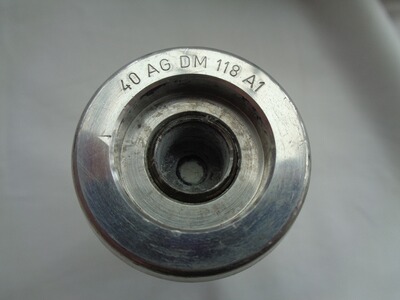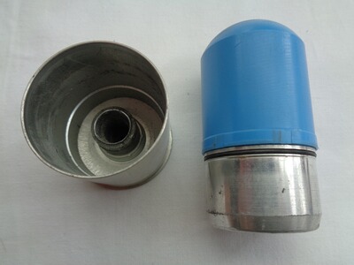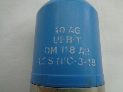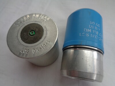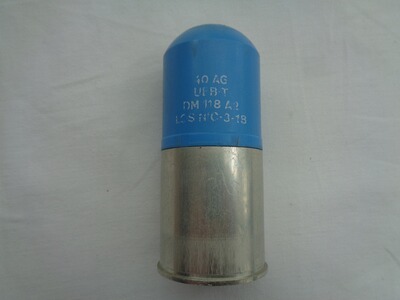 Verkaufe eine gebrauchte Bundeswehr 40mm Übungsgranate DM118A1/A2 (Hülse 40x46mm Rand, blaues Kunststoffgeschoss) in abgeschossenem/leerem Zustand.