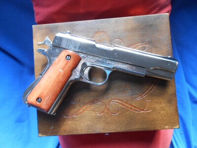 Antike Holzschatulle,die profihaft so gestaltet wurde,das sie einen Colt 1911 und Zubehör passgenau aufnimmt.Die passende Pistole,eine neuwertige Modellwaffe von Denix ,gibt es dazu,mit org.Denix Verpackung.Die Pistole ist verchromt,hat schöne Holzgriffe,man kann den Schlitten nach hinten ziehen und abschlagen,sonst kann sie nichts,trotzdem ist sie hochdekorativ und kostet bei Sportwaffen Schneider fast 100 Euro.