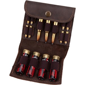 Das Etui bietet Platz für eine Vielzahl an Patronen. Es können 4 Schrot-, 3 Kugel- und 8 kleinere Patronen im Kaliber .22 lfB bis .22 Hornet ordentlich verstaut werden. Die kompakte und durchdachte Anordnung erleichtert den schnellen Zugriff. Ideal für den Einsatz bei Jagdausflügen oder auf dem Schießstand.