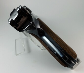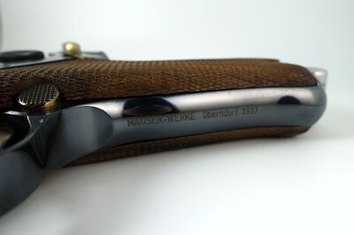 Produktbeschreibung: Mauser in Oberndorf hat 1997 diese Sonderedition von 250 überarbeiteten Parabellumpistolen aus Kriegsproduktion herausgebracht. Preis zur Jahrtausendwende: 1800 DM. Zustand dieses Exemplars ist neuwertig! Lauf blank, Oberflächen poliert und hochglanzbrüniert, Bedienelemente vergoldet. Lediglich dem Magazin (mit Aluboden) ist das eigentliche Alter der Waffe anzusehen. Die modernen Beschusszeichen befinden sich unauffällig unter der Verriegelungsplatte. Holzgriffschalen mit Fischhaut. Gabel gekennzeichnet mit ursprünglichem Produktionsjahr 1940, Verschluss mit Mauser-Herstellercode "42", auf der Griffinnenseite beschriftet mit "MAUSER-WERKE Oberndorf 1997". Verschluss und Griffstück sind - soweit ersichtlich - nummerngleich. Der Mauser Koffer ist außen sehr gut, innen ist der Schaumstoff altersbeding schon etwas mitgenommen.