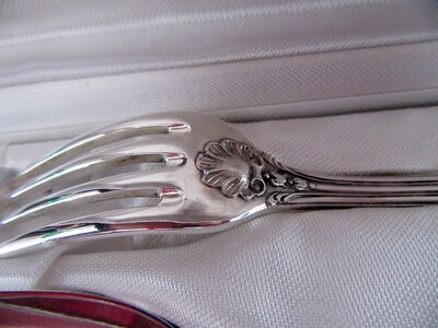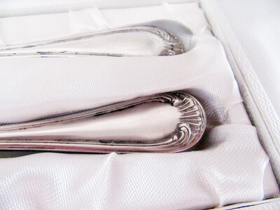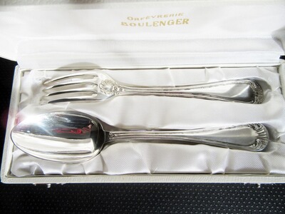 Art Deco Set bestehend aus einem Löffe und einer Gabel mit Muscheldekor. Gestempelt ist das reizende Set mit dem Schirftzug Boulenger sowie der Punze „Blanc 60“. Das Besteck ist gebraucht und in der original Schatulle. Löffel: eiförmige Laffe, rückseitig mit Muscheldekor. Gabel: Kelle mit vier Zinken, rückseitig mit Muscheldekor.