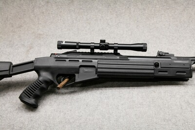 Inklusive Mündungsbremse und 11-mm-Prismenschiene. Lauflänge 37 cm, Geschwindigkeit ca. 170 m/s, max. 7,5 Joule, Gesamtlänge 113,5 cm, Gewicht 2.750 g.