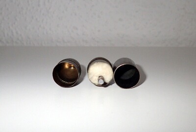 Vermutlich Messing, jedoch recht abgenutzt auf der einen Seite. Die Kappe auf der Seite, wo man das Benzin einfüllen kann, ist schwergängig.