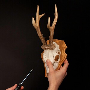Trophäenschild Bock, Eiche hell, massiv. Mit Kiefereinlage. Größe 20,5x12cm.
