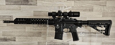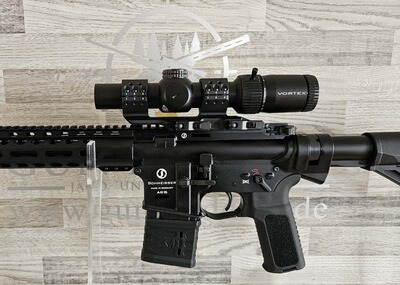 als einsatzfertiges Set, montiert mit Zielfernrohr VORTEX Strike Eagle 1-8x24 Absehen AR-BDC3 auf einer Schmeisser SM30 Schnellspann-Brückenmontage.