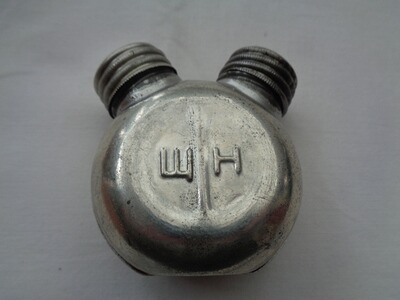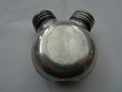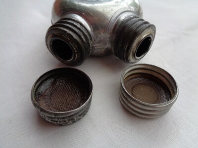 Der runde Öl-/Fettbehälter aus Aluminium besitzt zwei Unterteilungen mit Prägebeschriftung in kyrillischen Buchstaben.