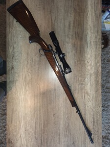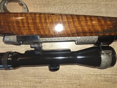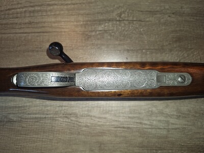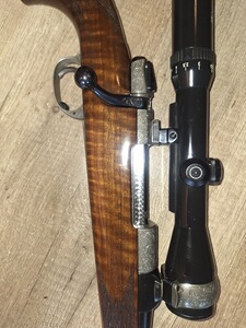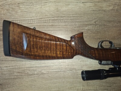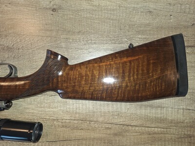 Ich verkaufe eine Repetierbüchse 98er Luxusausführung. Als Grundlage diente ein Original DWM System mit einem Lothar Walther Lauf im Kaliber 9,3x62. Das System, Magazindeckel, Montagering und Sicherung sind nitriert und mit Arabeskengravur versehen. Es wurde ein Recknagel Einabzug verbaut und eine Recknagel Sicherung. Das Zielfernrohr, Schmidt &Bender ist ein Drückjagdglas 1,5-6x42, montiert mit einer SEM. Die Waffe hat eine offene Visierung und ist mit einem Mündungsgewinde versehen. Ausgestattet mit einer Mündungsbremse. Schalldämpfer problemlos nutzbar. Die Waffe hat einen Luxusschaft mit ausgesuchtem Schaftholz, Rosenholzabschluss und bayerische Backe.