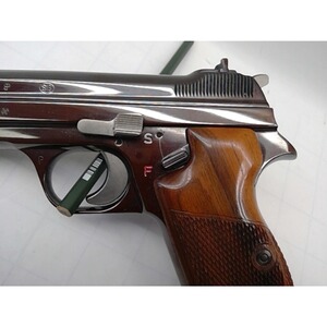 Die SIG P210-1 verfügt über ein 8-Schuss-Magazin und eine Lauflänge von 12 cm. Sie wurde aufwändig poliert und besitzt ein makelloses Finish im charakteristischen Braunton, der auf einen hohen Chromanteil im Material hindeutet. Das Magazin ist ebenfalls poliert. Die Waffe trägt das K+ im W als Heeresabnahme sowie das P für die Privatisierung.