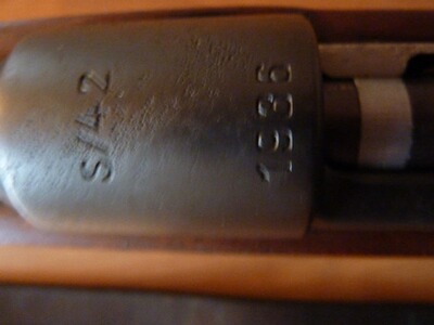 gleich (8941). Das Schloss hat die Nr. 5411 und ist in sich nummerngleich. Die Waffe ist in einem sehr guten Zustand, nur auf dem Kammerstengel sind alte Rostnarben (siehe Bild), die aber irgenwie