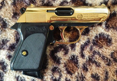 Verkaufe hier eine Walther PPK Gold 8mm, sie ist einzigartig und so nicht nochmal erhältlich da sie selbt bei einen Bücksenmacher mit Blattgold vergoldet wurde.