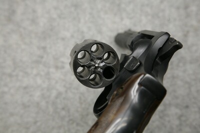 Kaliber .38 Spezial. Lauflänge 4" / 102 mm, Trommel für 6 Patronen, Double-Action-/Single-Action-Abzug, Gesamtlänge 235 mm, Gewicht ca. 965 g.