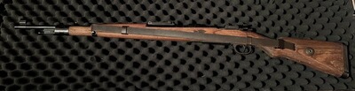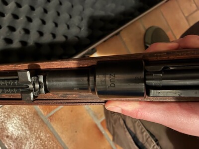 Der Karabiner 98k bnz 41 ist ein originaler Karabiner, hergestellt von Steyer-Daimler-Puch mit dem Herstellungscode bnz und der Jahreszahl 42. Der Karabiner wurde im Beschussamt München geprüft und an verdeckten Stellen bestempelt. Laut Prüfer ist die Waffe inklusive Lauf nummerngleich, beim Schaft besteht Unsicherheit. Die Magazineinheit ist nicht nummerngleich. Der Riemenbügel ist ein Replikat. Lauf und Züge sind gut zu erkennen und scharfkantig.