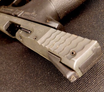 Optisch ähnelt der Schreckschussnachbau seinem Original sehr, und die Originalmaße wurden eingehalten. Das Griffstück ist rutschfest gestaltet, während alle Bedienelemente flach anliegen aber gut erreichbar sind. Die Züngelsicherung gibt den Abzug nur frei, wenn geschossen werden soll.