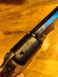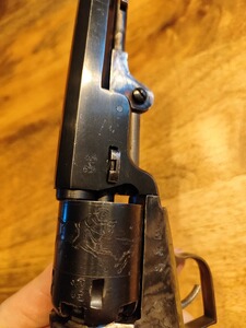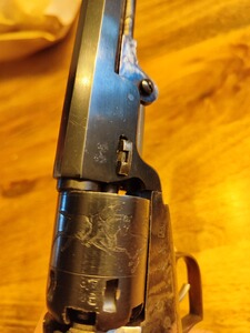 Replika eines brünierten, 5-schüssigen Perkussionsrevolvers mit offenem Gehäuse und 4-Zoll-Lauf. Die Trommel ist mit einer rollgeprägten Kampfszene zwischen Unionssoldaten und Indianern verziert. Der eckige Abzugsbügel und der Griffrücken sind aus Messing.