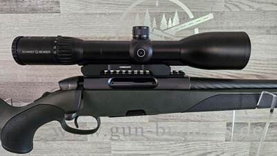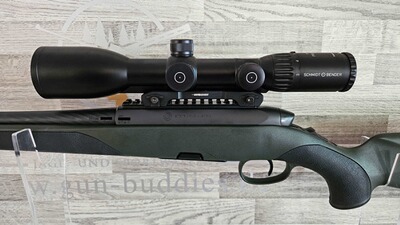 Als einsatzfertiges Komplettset montiert mit einem Zielfernrohr Schmidt & Bender T96 Polar 3-12x54 mit Zeiss-Schiene (P LMZ 2.BE D7 1cm cw Posicon CT / Posicon CT - Artikel-Nr. 754-K11-72D) auf einer Innomount FM-Blockmontage, plus einem Schalldämpfer RCC Carbon 44 Hunter, inklusive gratis Neopren-Gewehrriemen olivgrün.