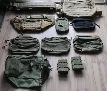 3x molle pouches, vorderseite netzmaterial. die lassen sich perfekt im rucksack ankletten
