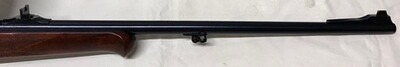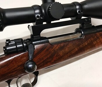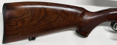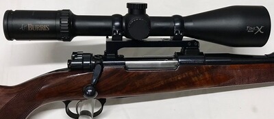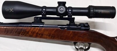 Die Repetierbüchse stammt aus einem Nachlasskonvolut und befindet sich in einem gepflegten und guten bis sehr guten Gesamtzustand. Die Brünierung ist zu 99,9% vorhanden. Das Laufinnere ist spiegelblank ohne sichtbare Beschädigungen, Züge und Felder sind scharf, was auf einen geringen Gebrauch schließen läßt. Der Luxus-Holzschaft und das System zeigen normale leichtere Gebrauchsspuren (siehe Bilder). Das integrierte Kastenmagazin faßt 5 Büchsenpatronen. Aufgewertet ist die Büchse mit einer Hebel-Schwenkmontage 30mm-Ring und einem Zielfernrohr BURRIS FourX 3-12x56, Abs. LA 4A-I, 2.BE.